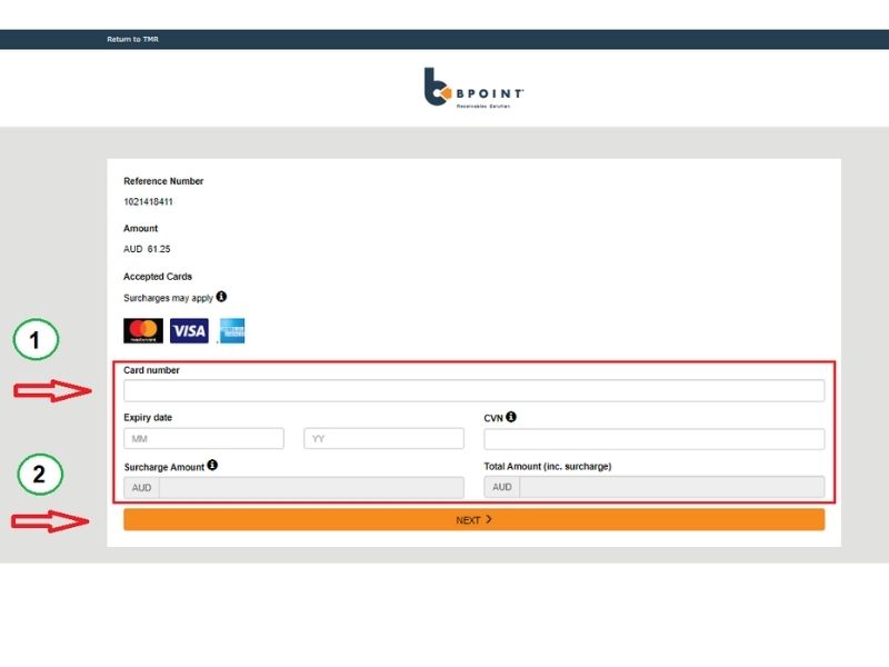 Simply enter your credit card details and press ‘NEXT’. Make sure you don’t close your browser until you receive a message that your payment has been successful. Note that there is a surcharge for the booking as well, which is just a few cents.